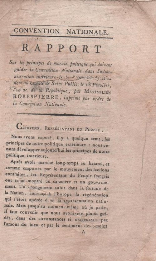 Document 2 : Discours de Maximilien Robespierre à la Convention Nationale, séance du 17 pluviôse an II- 5 février 1794, présenté au nom du Comité de salut public, Sur les principes de morale publique qui doivent guider la Convention Nationale dans l’administration intérieure de la République.