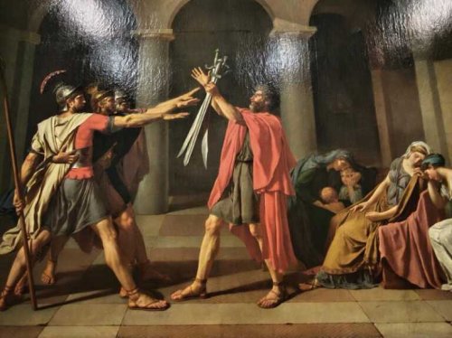 Mais, ce dont témoignent les premiers tableaux du parcours du Louvre, dont Bélisaire demandant l’aumône (1780), il se tourne vers le Caravage et ses suiveurs, le clair-obscur et la tension dramatique, puis vers une vision morale qu’incarne en 1785 le Serment des Horaces jurant devant leur père de défendre Rome contre les Curiaces de la ville d’Albe.