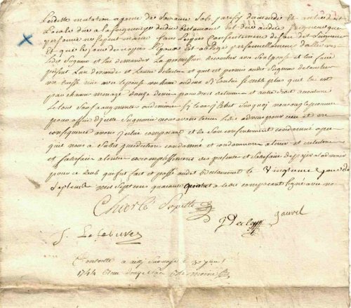 Sur quoi nous, oui le procureur pour office d’icelle seigneurie, nous avons tenu Iedit aveu pour reçu et, en conséquence, avons icelui comparant, après qu’il nous a subi juridiction et de son consentement, condamné et condamnons de satisfaire à l’avenir à l’entier accomplissement des présentes ; qui fut fait et passé à Bertaucour par moi, Jean Decler, greffier [13] comme soussigné, et a signé avec nous, le jour dix-sept septembre du mois, de l’année mil-sept-cent-quarante-quatre.