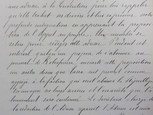 On reprend la discussion sur Louis Capet. Diverses opinions sont prononcées ; on s’arrête principalement à combattre l’appel au peuple que l’on considère comme le tocsin de la guerre civile ; on soutient et on démontre que le peuple français en élisant une Convention nationale lui a imposé le devoir impérieux non de condamner mais de punir Louis Capet ; et que si la ratification des Assemblées primaires n’est une conspiration infernale elle est une absurdité surabondante puisque le premier acte de la Convention si elle eut été fidèle à son mandat devait être la punition de Louis Capet. Ces vérités puisées dans la nature et dans la justice frappent l’assemblée, elle arrête qu’il sera fait sur le champ une adresse à la Convention pour lui rappeler qu’elle trahit ses devoirs et lui exprimer notre profonde indignation en apprenant la proposition de l’appel au peuple. Un membre se retire pour rédiger cette adresse. Pendant cet intervalle quelqu’un propose de s’abonner au journal de Robespierre ; on écarte cette proposition un autre désire que Carra soit proscrit comme agrégé à la faction qui veut abaisser la République On invoque ses longs services et l’on arrête que l’abonnement sera continué. Le secrétaire chargé de l’adresse reparait ; l’Adresse est mise aux voix et adoptée à l’unanimité. Un membre observe qu’on a oublié d’y témoigner notre douleur et les querelles individuelles qui déchirent la Convention ; cette observation est ajournée à mardi avec la notion de conjurer l’assemblée d’ôter à (mots barrés : au conspirateur) ( sic) Roland les cent mille livres dont il fait un aussi étrange abus dans la distribution de ses imprimés. On arrête qu’il sera fait trois copies de l’adresse dont l’une sera signée et envoyée à la Convention l’une aux Jacobins et la dernière à Guffroy afin qu’il put en donner connaissance à ses collègues si le Président ou les Secrétaires l’escamoteraient.